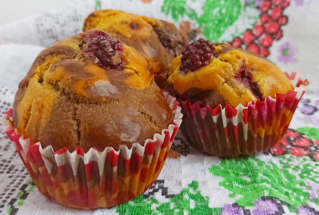 Adaugam restul de mure in aluatul fara carob, procedam la fel, amestecam cu o paleta de sus in jos cu atentie ca murele sa ramana intregi.