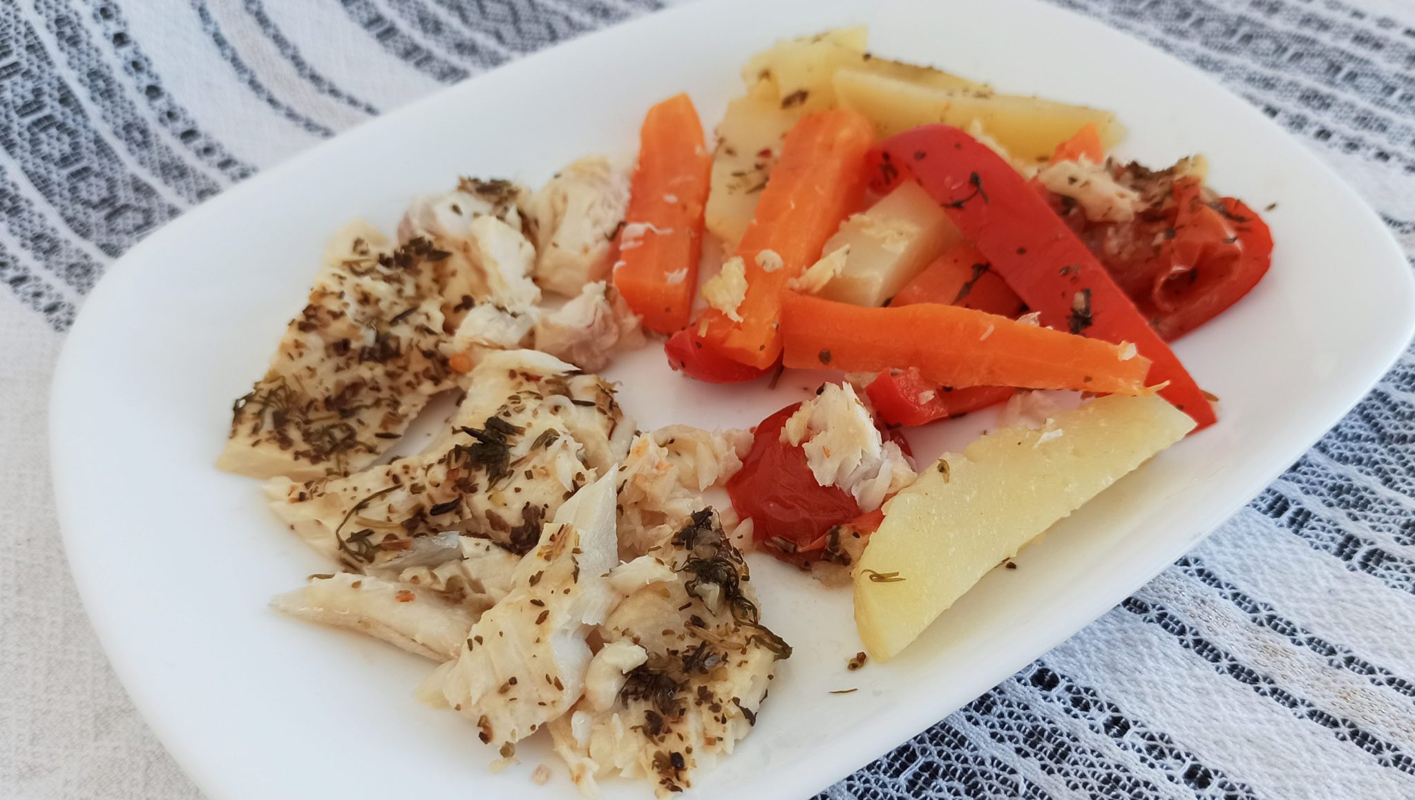 Spalam si curatam legumele, le taiem dupa preferinta. Spalam pestele si il punem in vasul de aburi cu legumele. Stropim pe deasupra cu ulei de masline si zeama de lamaie, presaram usturoiul pisat, ierburile de provence si mararul. Gatim la aburi cca. 20-25 minute. Curatam pastravul de oase si pielita, punem in farfurie alaturi de legume si servim.