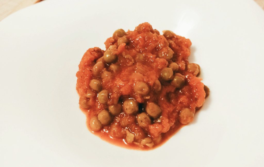 Punem ceapa si morcovul la inabusit cu lingura de ulei si putina apa. Adaugam apa calda la nevoie pana acestea sunt moi. Adaugam mazarea, foaia de dafin, condimentele si paharul cu apa (apa sa treaca bine peste mazare), lasam pe foc pana mazarea este fiarta. Adaugam pasta de tomate si lasam sa fiarba inca 5 minute, amestecam ocazional.