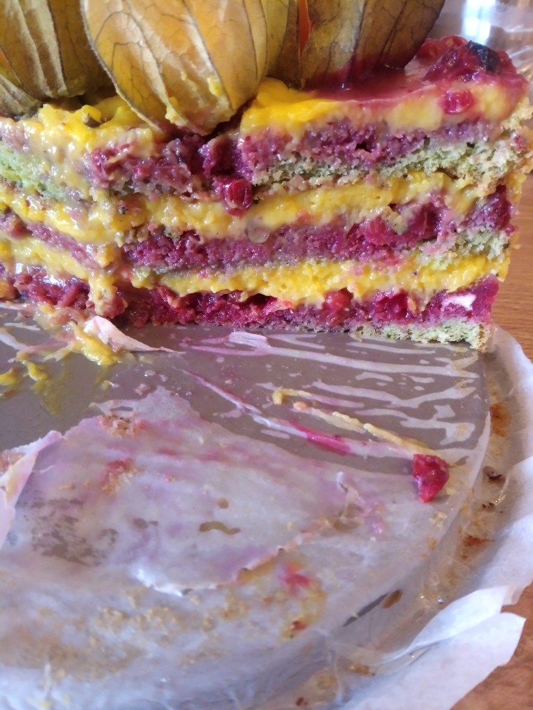 Am decorat cu un strat de crema, jeleu pe margini si fructe de physalis. Pofta buna 🥰