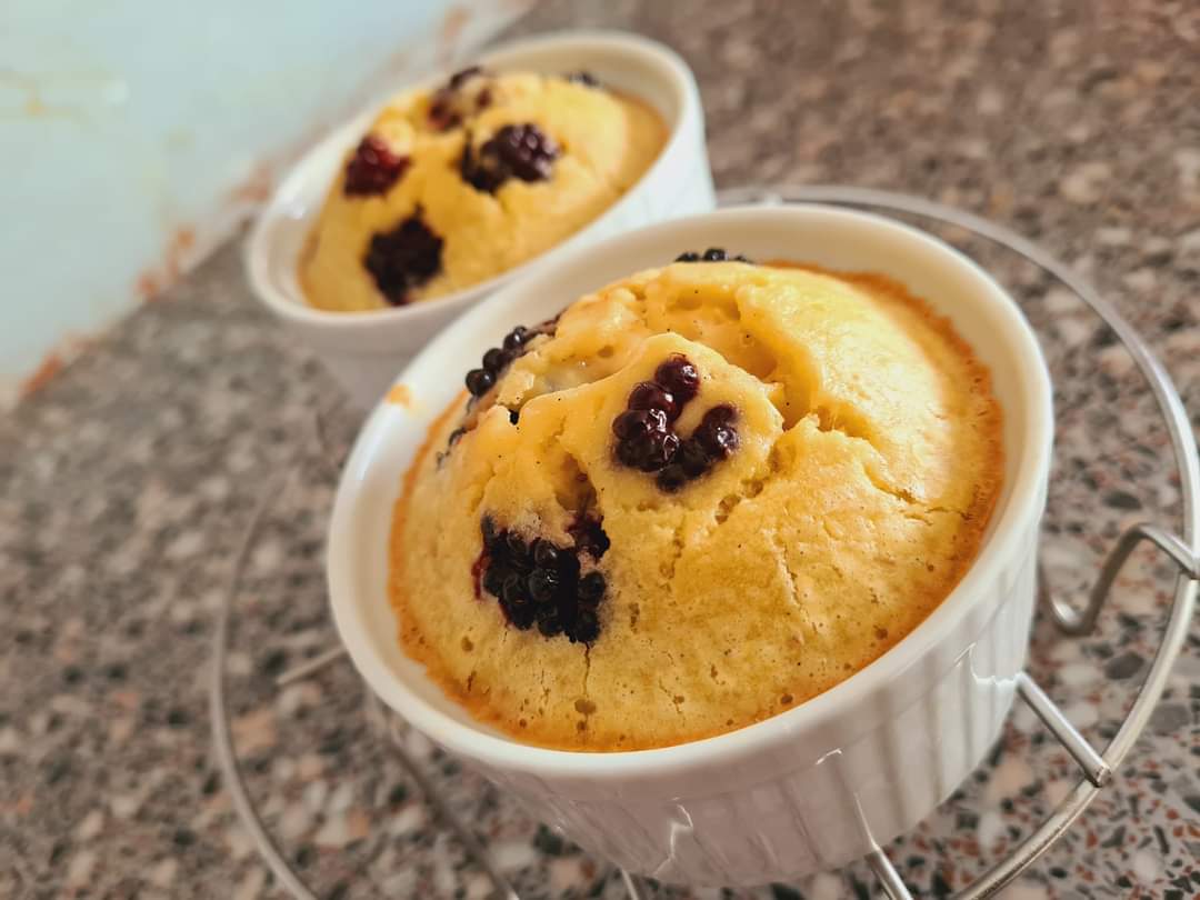 Punem compozitia in doua forme ramekin unse cu unt. Deasupra adaugam murele taiate in doua respectiv in 4, in functie de marime, apasam pe cateva pentru a intra in aluat.