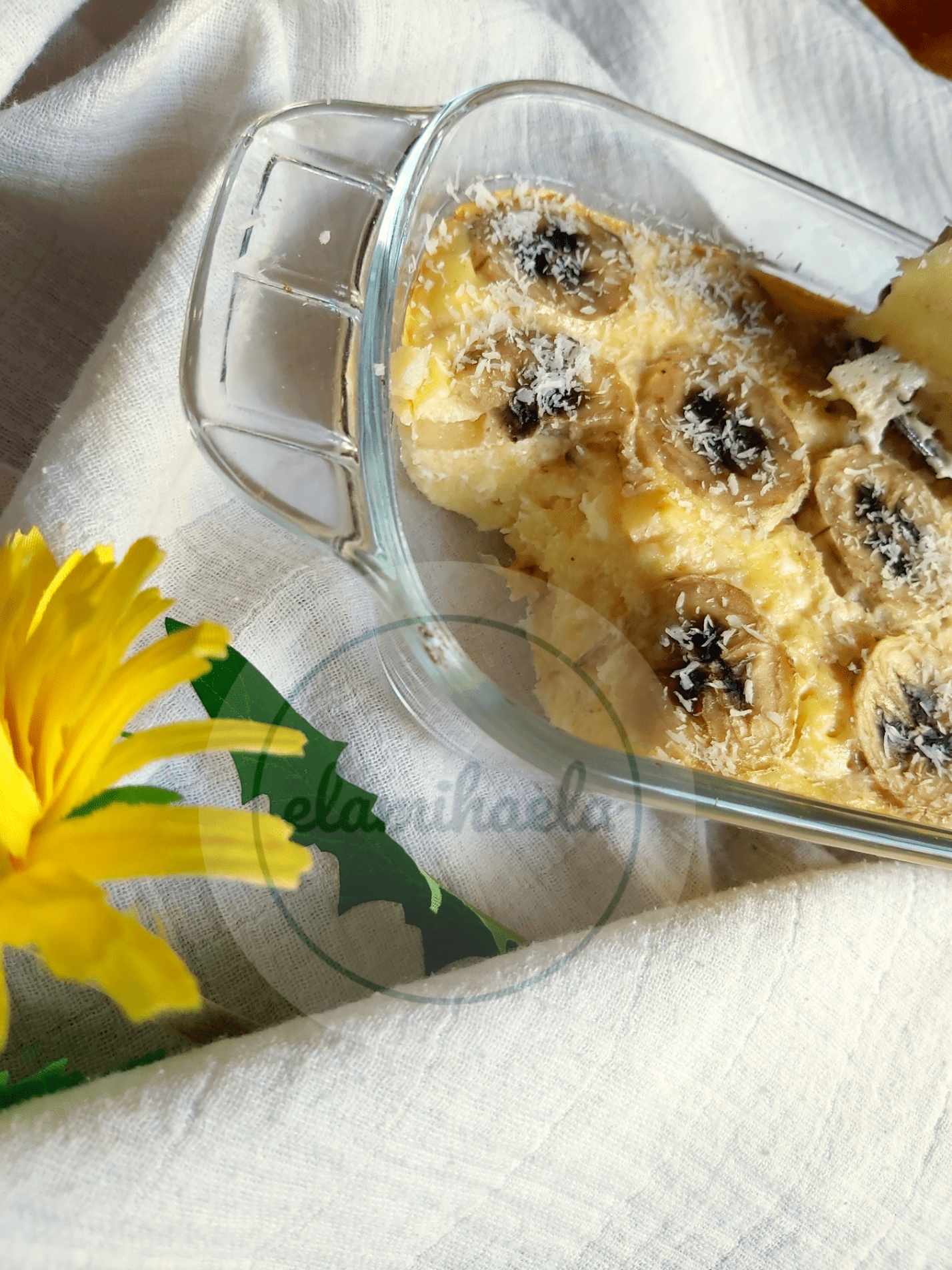 Am uns forma cu unt, iar pe fundul ei am pus felii, 1/2 de banana. Am turnat apoi compozitia peste banana, iar deasupra am asezat cealalta 1/2 de banana, taiata felii.