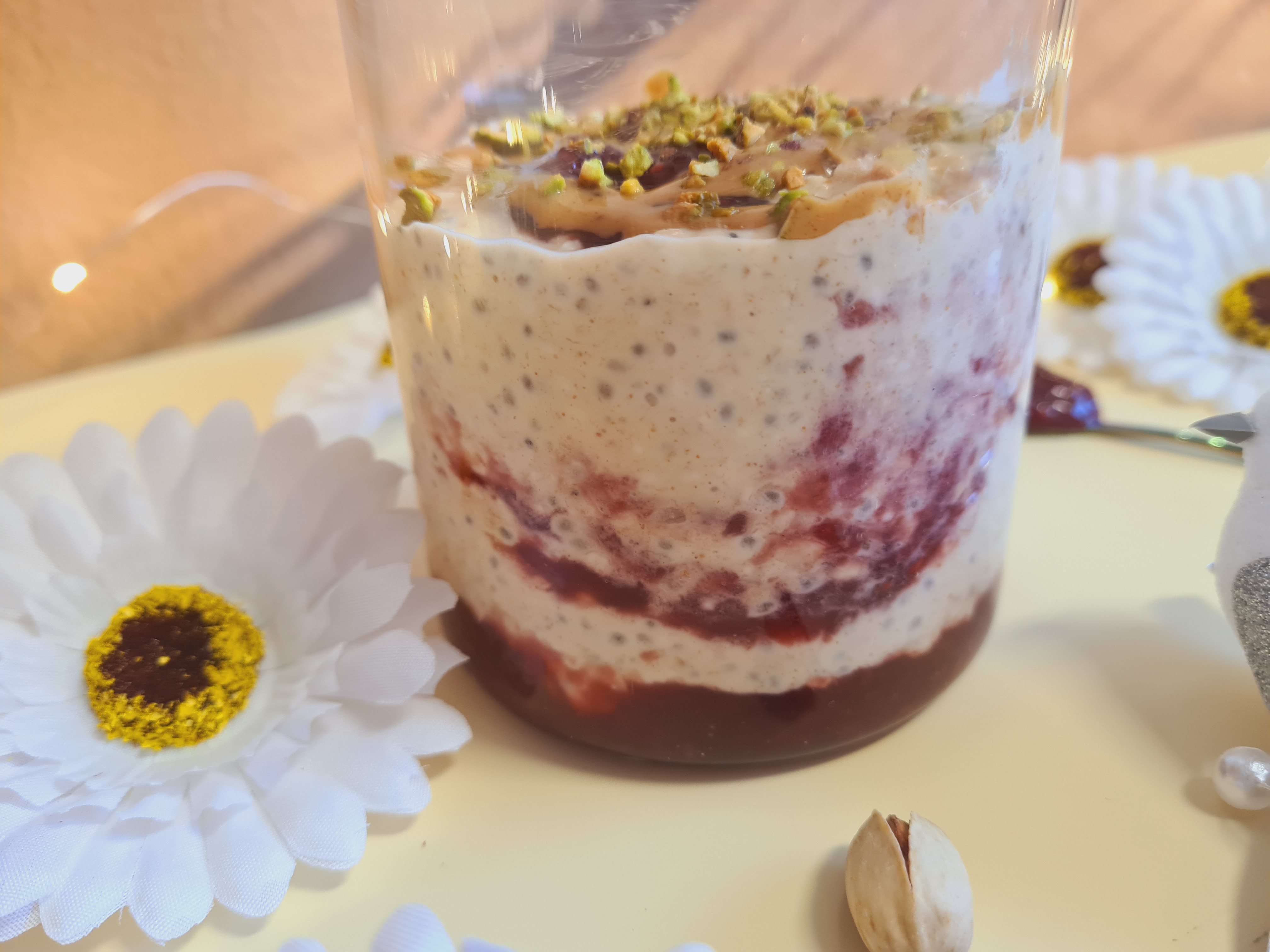 4. Am pregatit ca de obicei baza, seara. Am folosit acum lapte de migdale si iaurt cu vanilie. Dimineata am amestecat preparatul astfel obtinut cu untul de arahide si fisticul curatat de coaja si blenduit usor, pentru a se face marunt. Am ornat in borcan cu ajutorul gemului pe care l-am pus pe ici-colo si am incorporat usor cu lingurita.