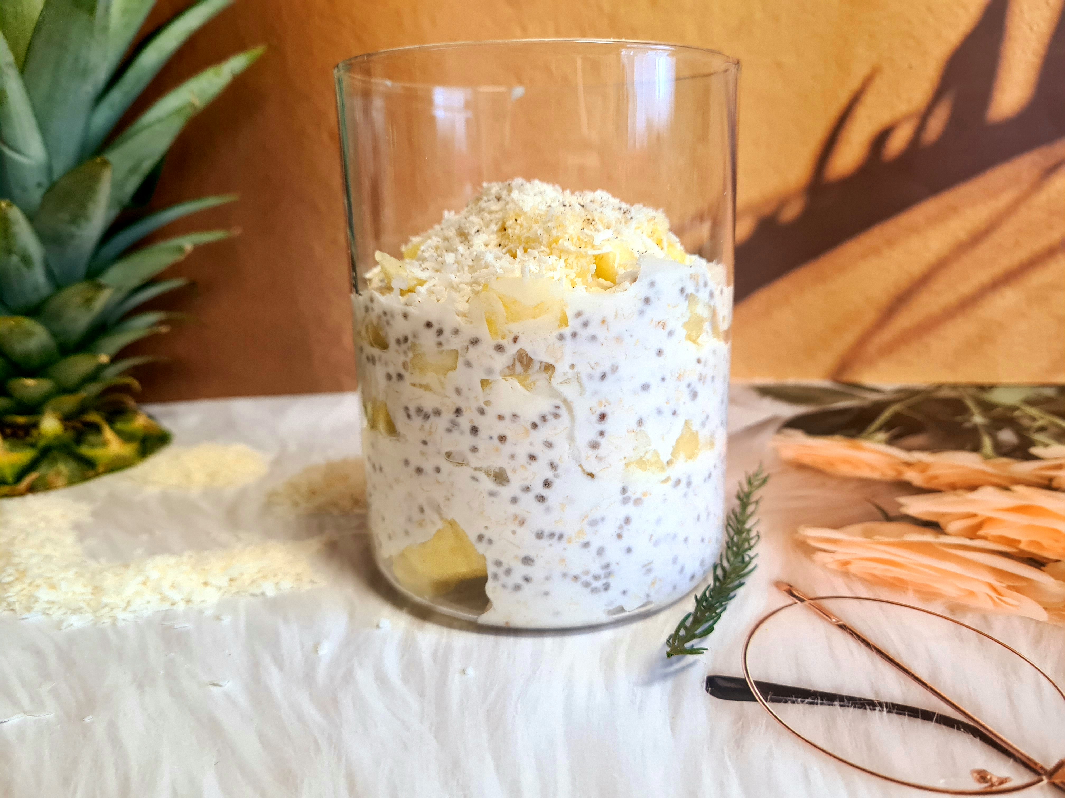 5. Am folosit lapte de cocos in reteta de baza. Dimineata, dupa ce am incalzit putin compozitia, am pus cateva linguri de overnight intr-un borcan, am adaugat o parte din ananasul taiat cubulete. Am adaugat iarasi putina compozitie, din nou cateva bucatele de ananas, acoperim cu restul de compozitie iar deasupra punem ananasul ramas. Ornam cu fulgii de cocos si pudra de vanilie.