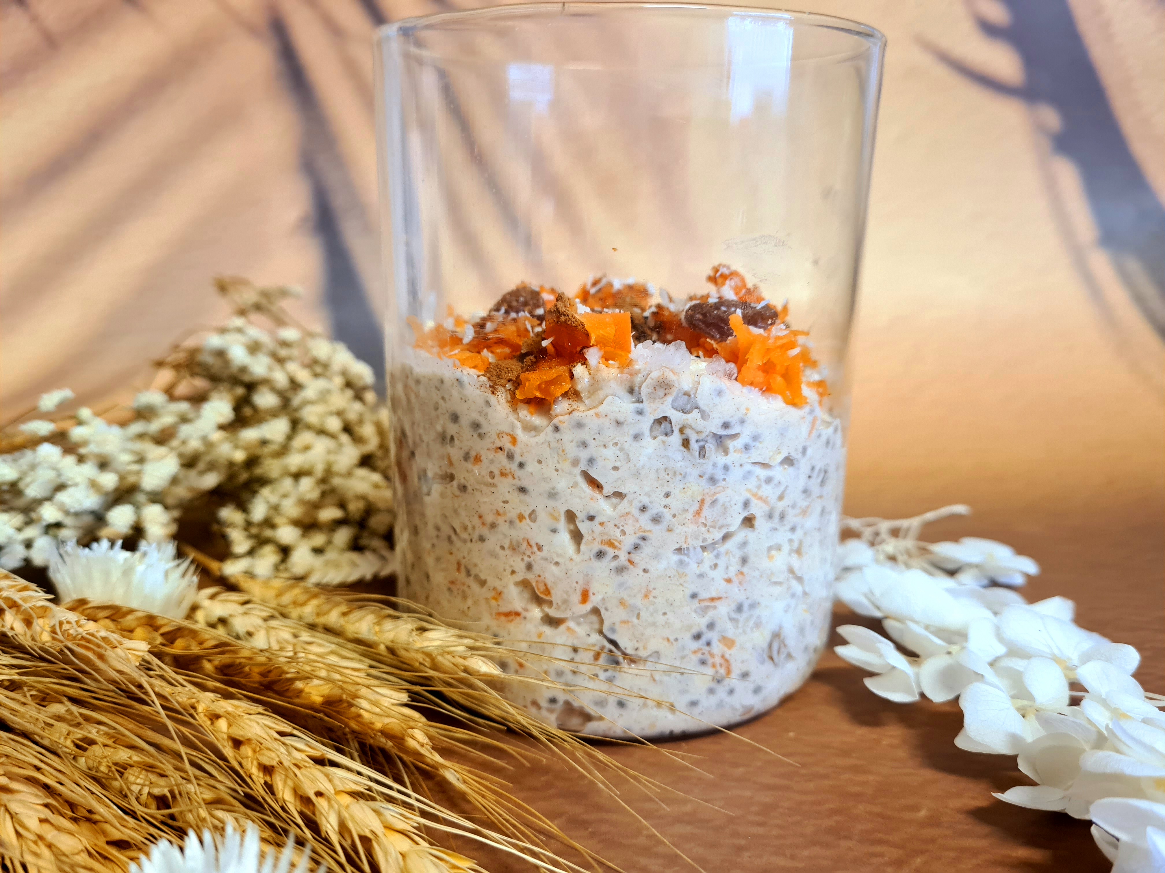 6. Am folosit lapte de migdale in reteta de baza. Ca de obicei, o preparam seara. Am pus in compozitie miere in loc de sirop si am adaugat stafidele. Inchis borcanul si la rece pana dimineata. Dimineata, am pus borcanul la incalzit 30 de secunde, am fiert un morcov mic la aburi pentru 10 minute. L-am dat pe razatoare in compozitie, am adaugat fulgii de cocos, scortisoara si vanilia, pastrand cate putin din fiecare pentru decor. Am amestecat si am ornat cu ce a ramas.