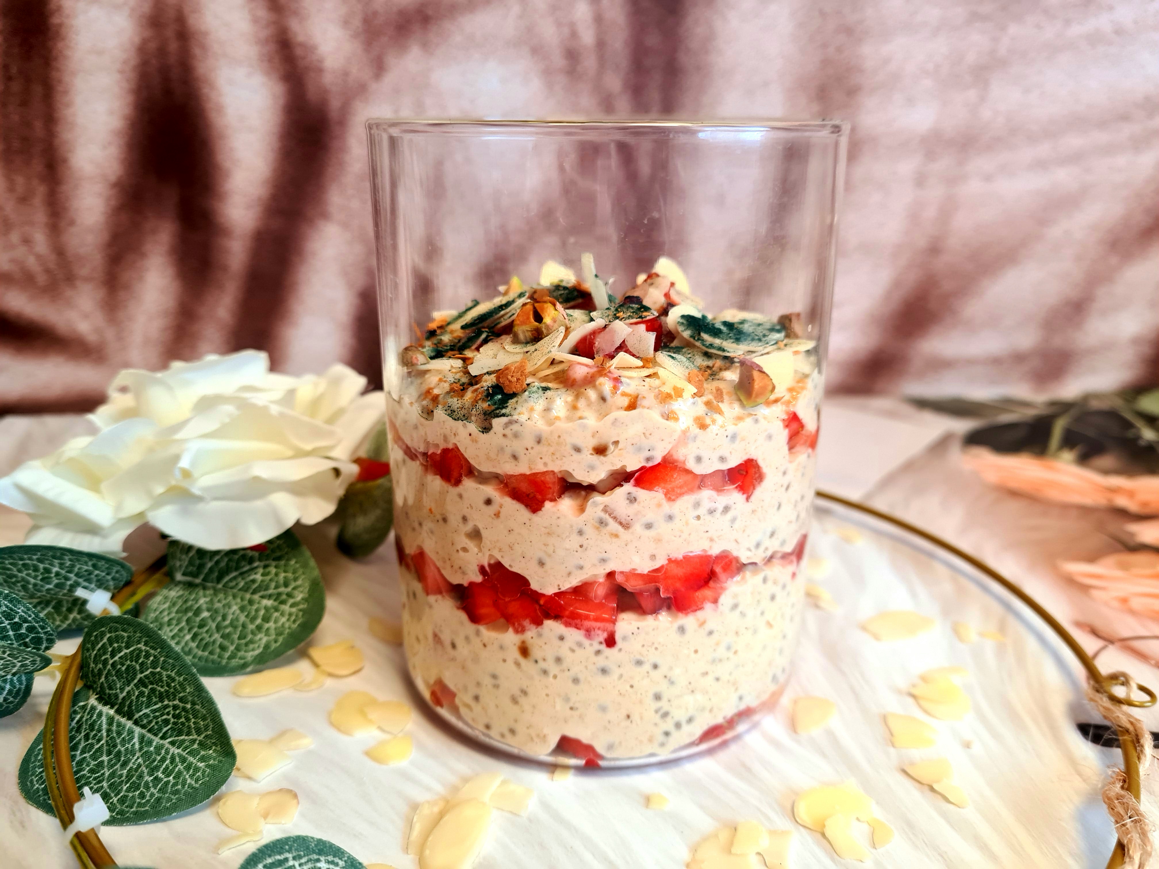 7. Am folosit in reteta de baza lapte de migdale cu coaja, fara zahar. Dimineata, am incalzit compozitia. Am amestecat-o cu vanilia si fulgii de drojdie inactiva. Am ornat in pahar: am taiat o capsuna cubulete mici pe care am pus-o pe fundul vasului. Am pus peste un sfert de compozitie din fulgii de ovaz hidratati, fulgi de migdale, capsuna cubulete, ovaz, migdale, capsuna, ovaz apoi am ornat cu capsuna, migdale, fistic tocat marunt si spirulina. Cel mai bine se vede in poza de mai jos. Puteti orna insa, cum doriti, gustul va ramane la fel de bun.