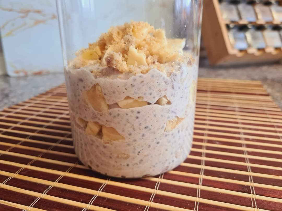 Pentru inceput pregatim baza, eu o fac pe aceasta mereu, dimineata schimb doar topingul. Folosind aceeasi cana, punem toate cantitatile intr-un borcan, le amestecam acolo bine, punem capacul si o dam la rece peste noapte. Puteti folosi orice fulgi de cereale, eu am folosit mix de 4 cereale. Laptele il puteti schimba, folosind alternativ lapte de vaca, de migdale, de cocos… eu am folosit lapte de migdale.