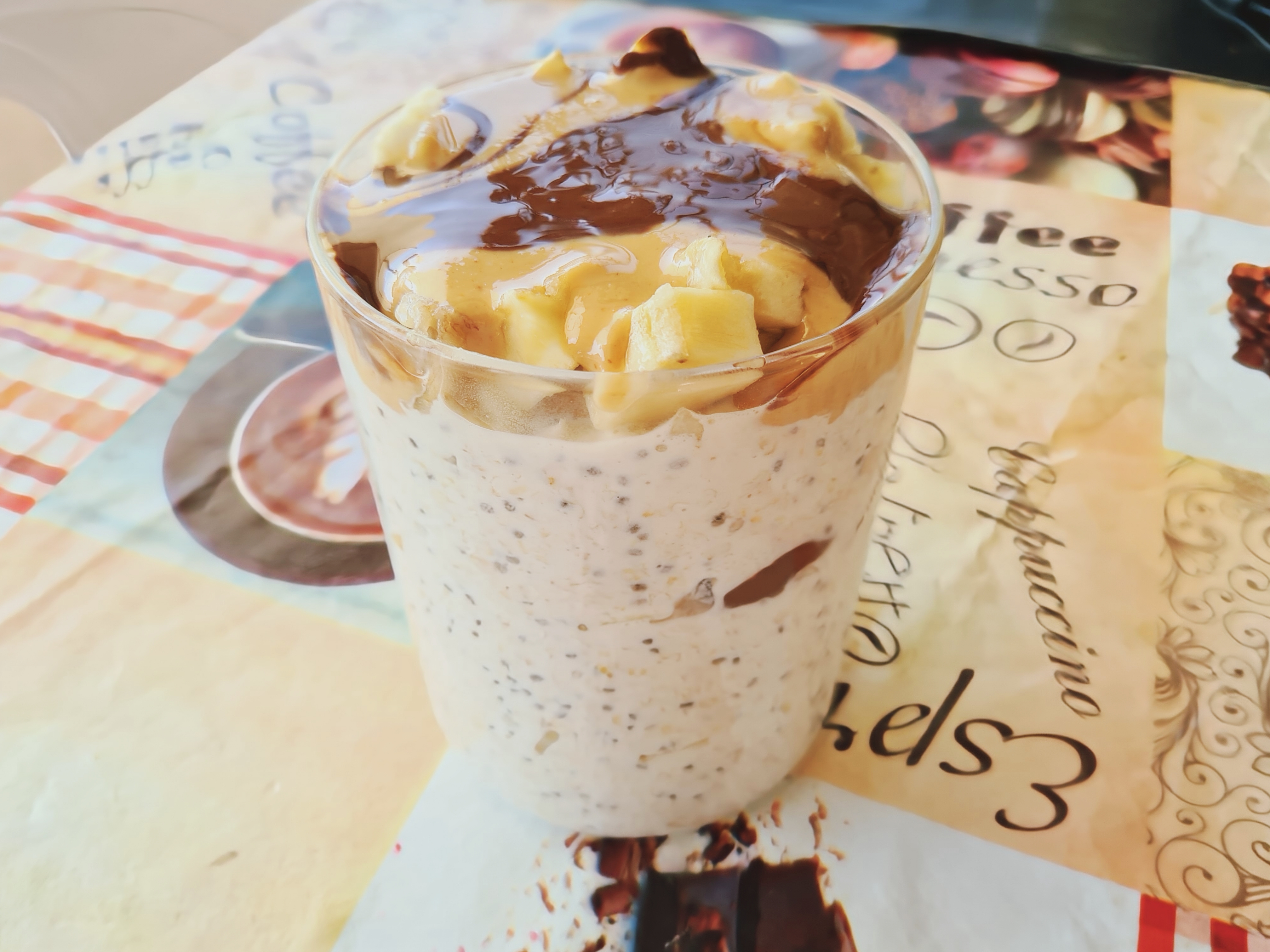 2. Dimineata, dupa ce am incalzit overnight-ul la microunde, am amestecat cu ingredientele, mai putin banana cubulete. Am aranjat in pahar, am pus cateva linguri de compozitie peste care am adaugat bucatelele de banana, pana am terminat compozitia.