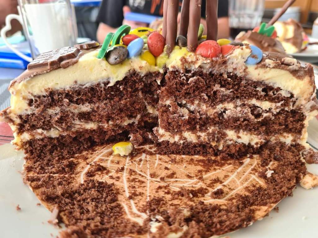 Pentru montat: Am taiat blatul in 3 si am pus crema intre straturi, peste ultimul strat si putin in lateral. Blatul mi-a iesit sfaramicios, nu l-am mai insiropat. Deasupra am ornat cu ciocolata topita cu unt, pusa de jur imprejur pe margine, in mijloc am pus bombonele.