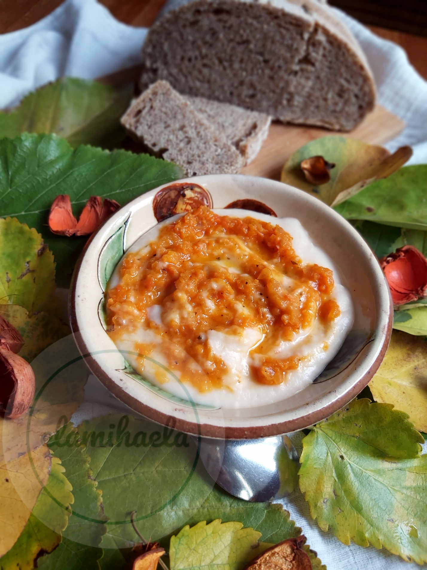 Am bagat-o apoi in blenderul vertical impreuna cu o lingura din cantitatea de ulei de masline si praful de usturoi. Am blenduit-o bine pana s-a facut pasta fina.