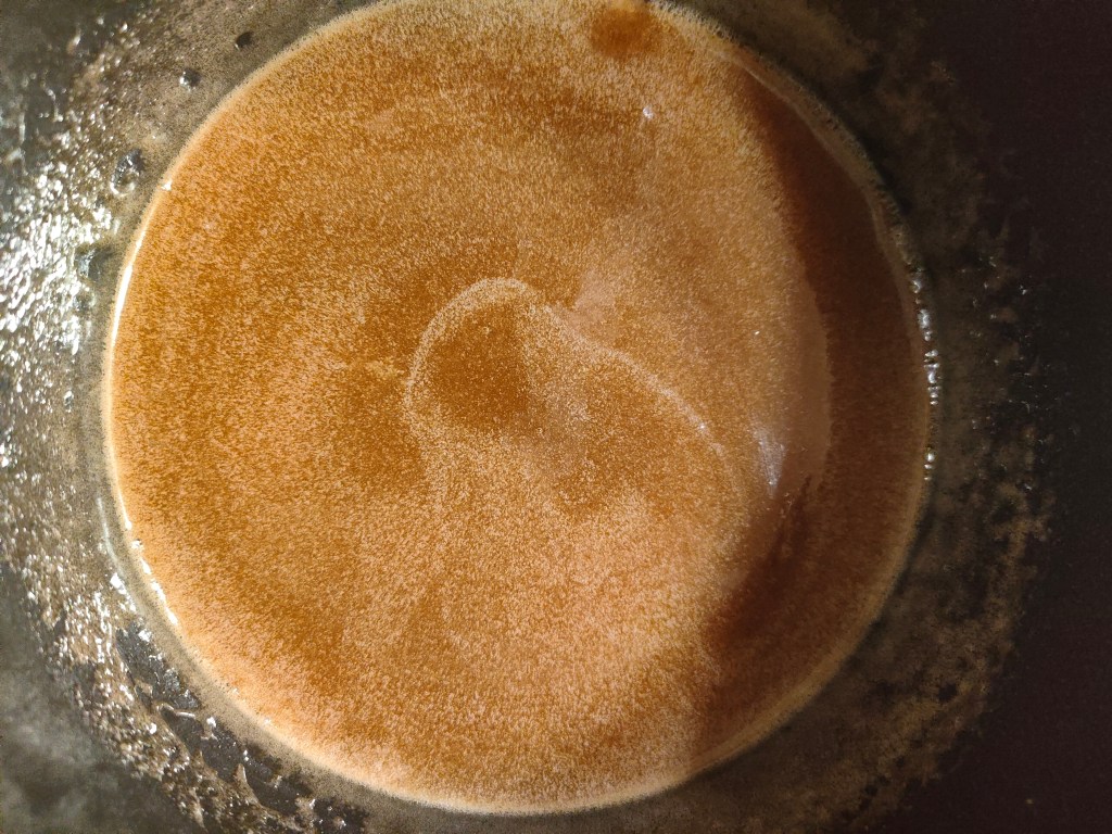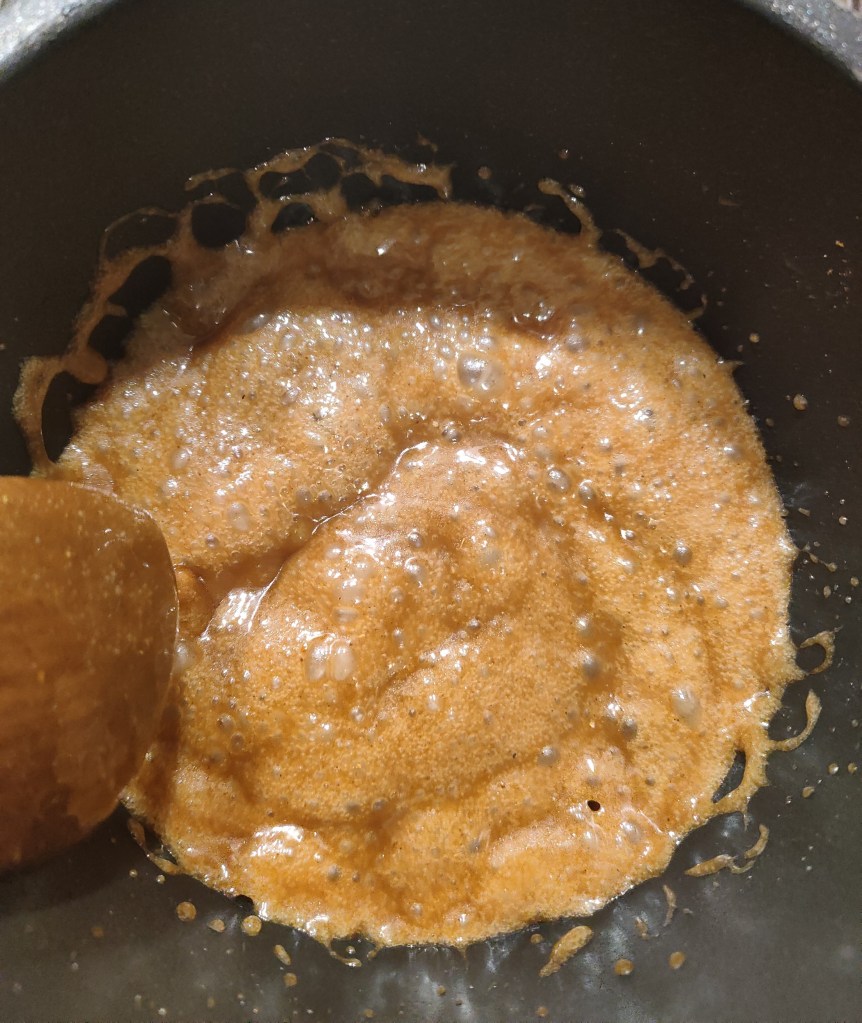 Adaugam apa si condimentul de turta dulce, fara a lua de pe foc, amestecam constant pana amestecul capata o nuanta de caramel.