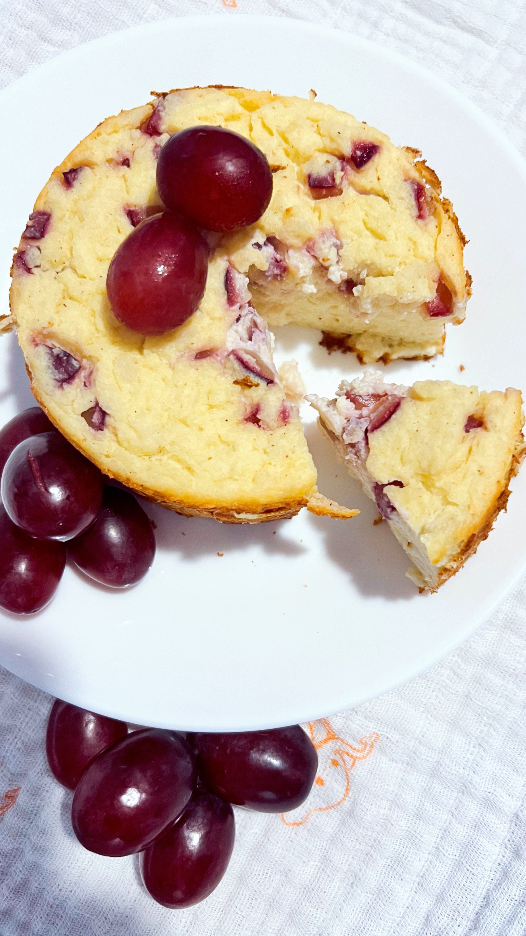 Ungem un vas ramekin cu unt, turnam compozitia, iar pe deasupra punem strugurii.