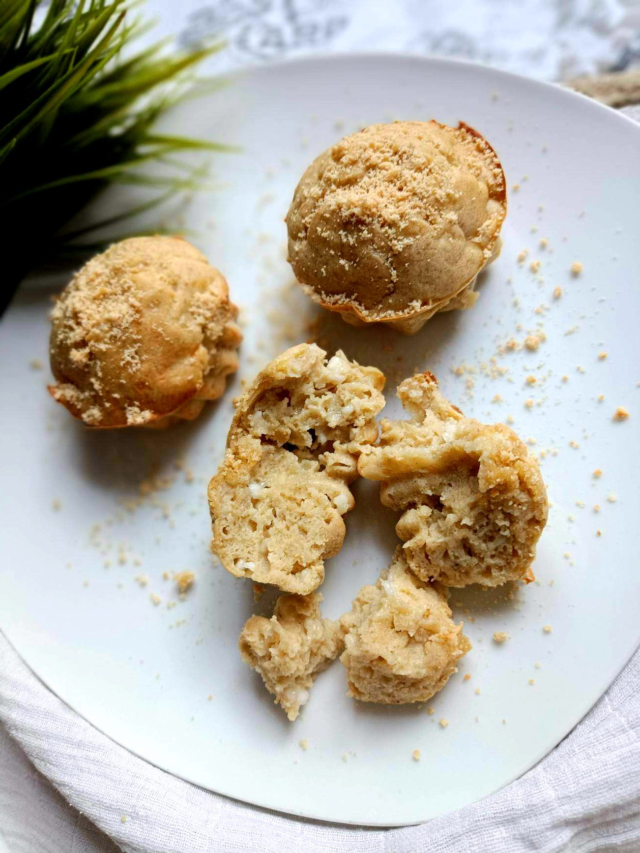 Le-am inglobat bine cu telul dupa care am impartit compozitia in formele de briose si le-am copt 40 de minute la 180° in cuptorul preincins, pana s-au rumenit frumos. Dupa racire am presarat caju-ul peste.