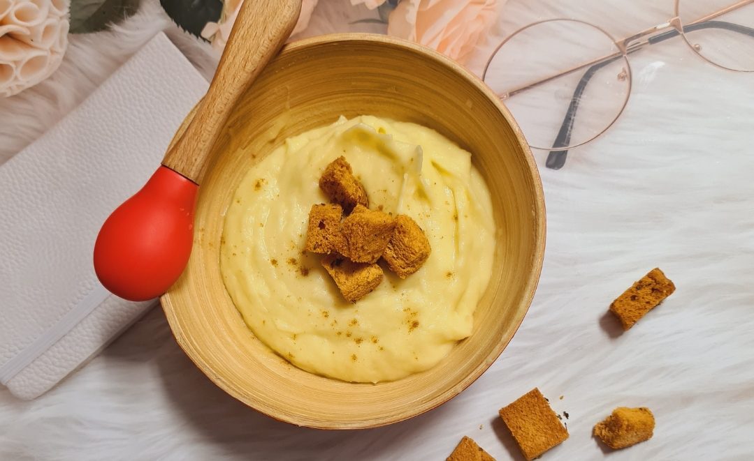 Alta varianta: putem blendui compozitia intr-o crema fina si o putem servi cu crutoane aromate. Am taiat cubulete o felie de paine toast, am stropit-o cu ulei si verdeturi uscate (patrunjel, oregano), am copt-o in cuptorul preincalzit la 160°C pana devin aurii, aproximativ 15 minute.