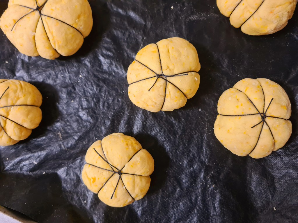 Luam fiecare bucatica si ii dam forma de minge, apoi cu o ata ii dam forma de dovleac. Gen cum punem panglici la cadouri, pun o poza mai jos sa vedeti. La capat am facut dublu nod.