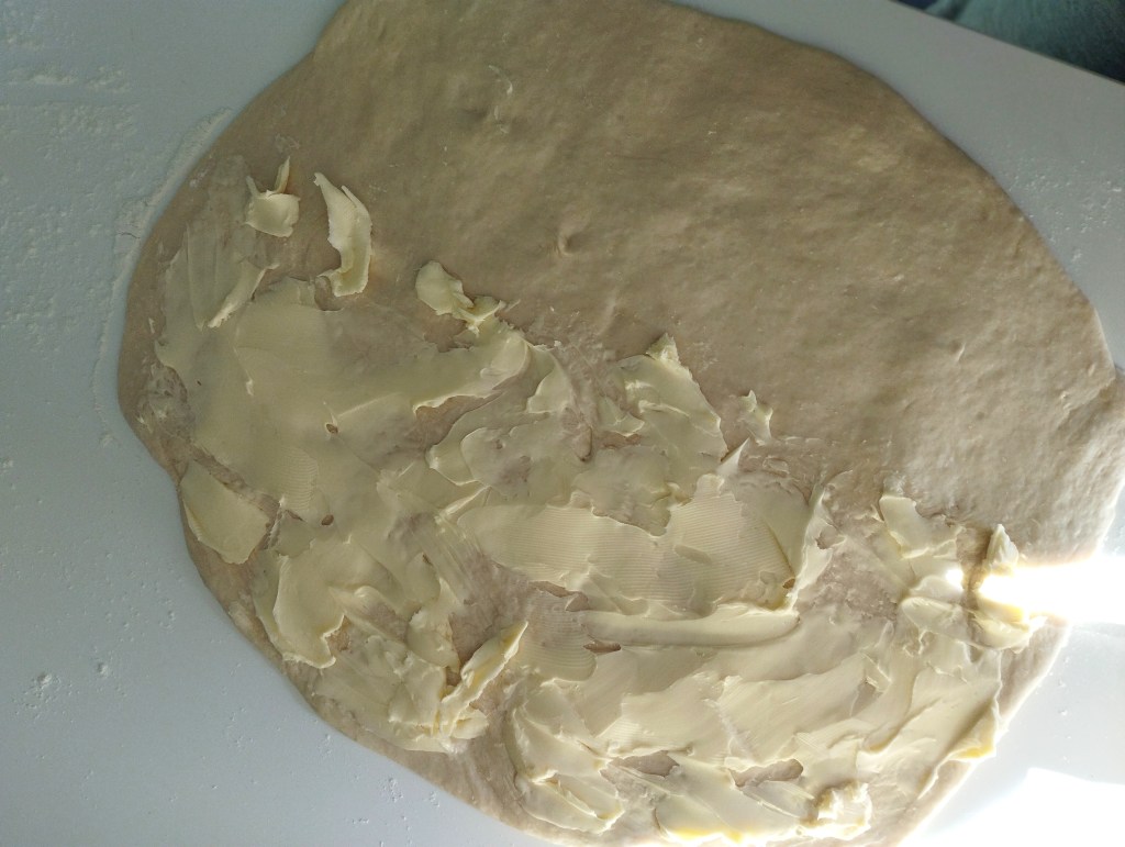 L-am pus apoi inapoi in castron, acoperit cu folie de plastic si lasat la loc caldut sa creasca, minim 2h. Dupa tot acest timp am scos aluatul si l-am pus pe blatul infainat intinzand-ul cat se poate de rotund. Pe jumatate din aluat am intins cu o spatula, untul pe care l-am scos sa fie la temperatura camerei, inainte sa ma apuc de treaba.