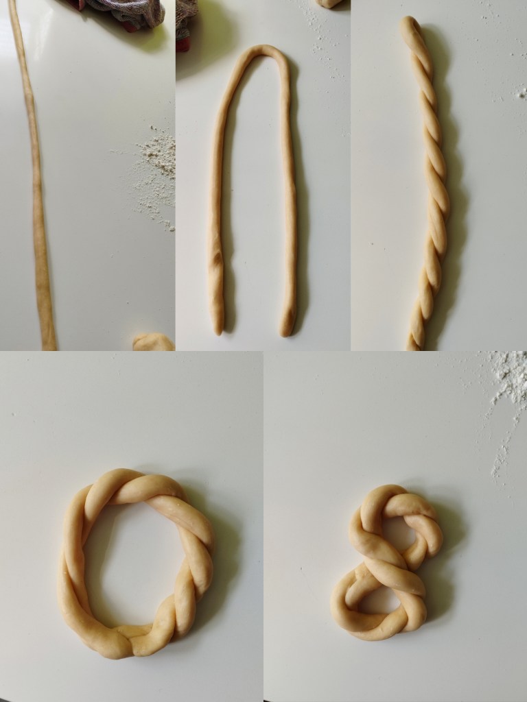 Dupa tot acest timp, am scos aluatul si am format din el bilute. 19 bucati mi-au iesit mie. Am intins apoi fiecare biluta sub forma de snur, mai apoi indoit in 2, impletit si format cate un 8 din fiecare. Voi atasa poze cu toti pasii.