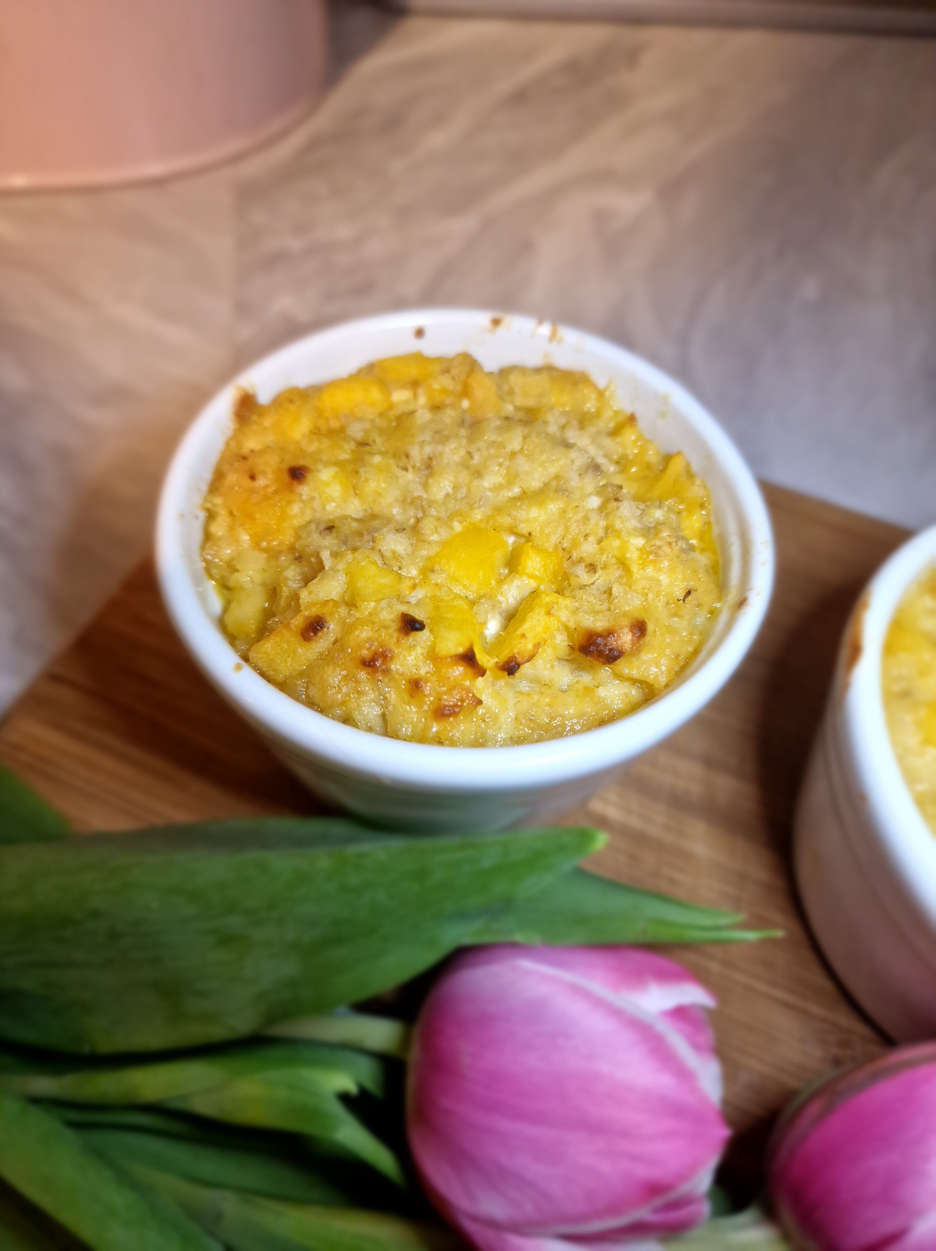 Am amestecat fulgii de ovaz cu merele si am pus totul in vase ramekin unse cu unt nesarat.