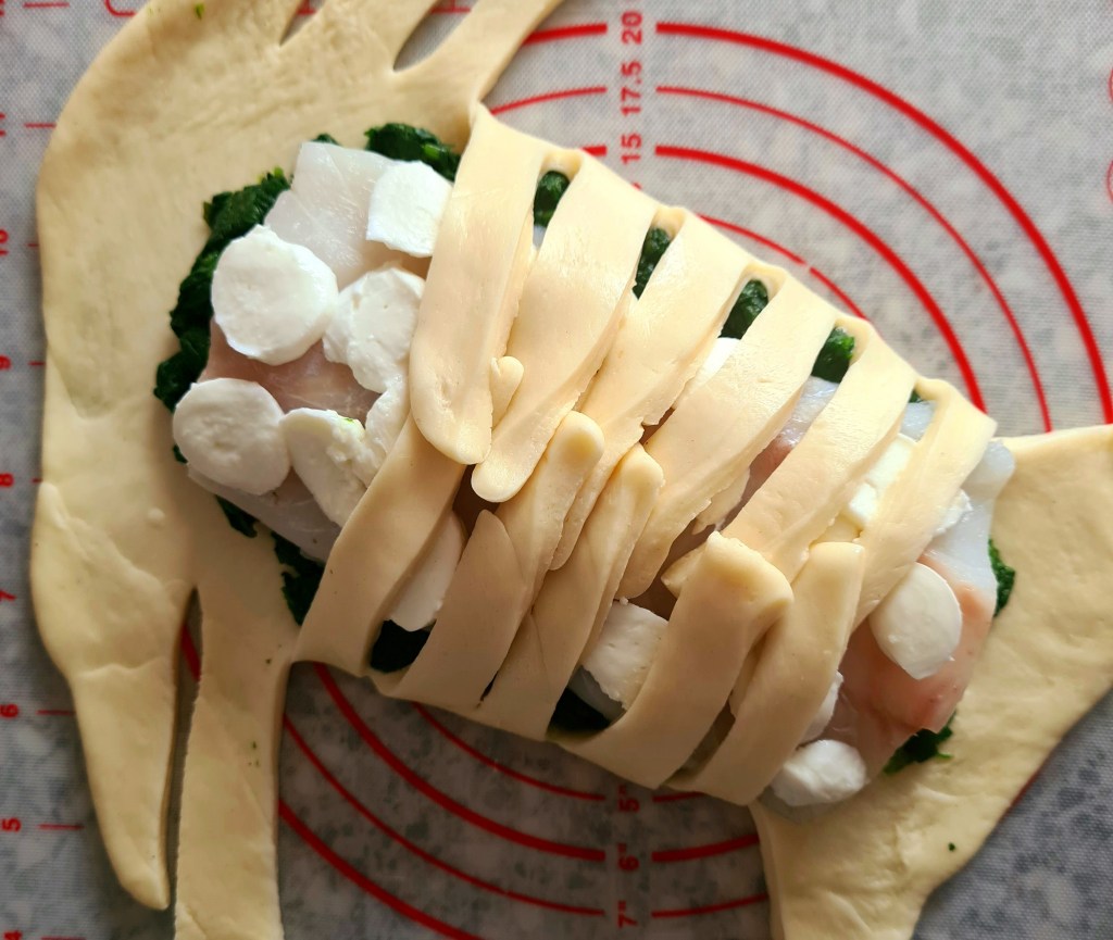 Intindem foietajul sub forma rotunda. Asezam spanacul pe mijloc, sub forma ovala. Peste adaugam pestele. Peste adaugam bilutele de mozzarella taiate feliute.