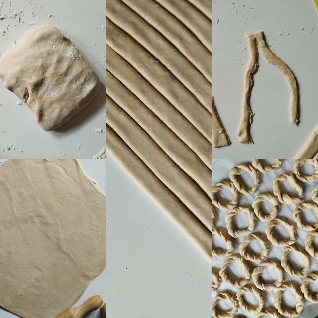 Am taiat fiecare fasie in 2 si impletit de la un capat la celelalt dupa care unit capetele impreuna avand grija sa lipesc usor capetele pentru a nu se desface in timpul coacerii. Am pus covrigii formati direct pe grilajul cuptorului (tava o am mica, asa i-am copt pe toti odata) tapetat cu hartie.