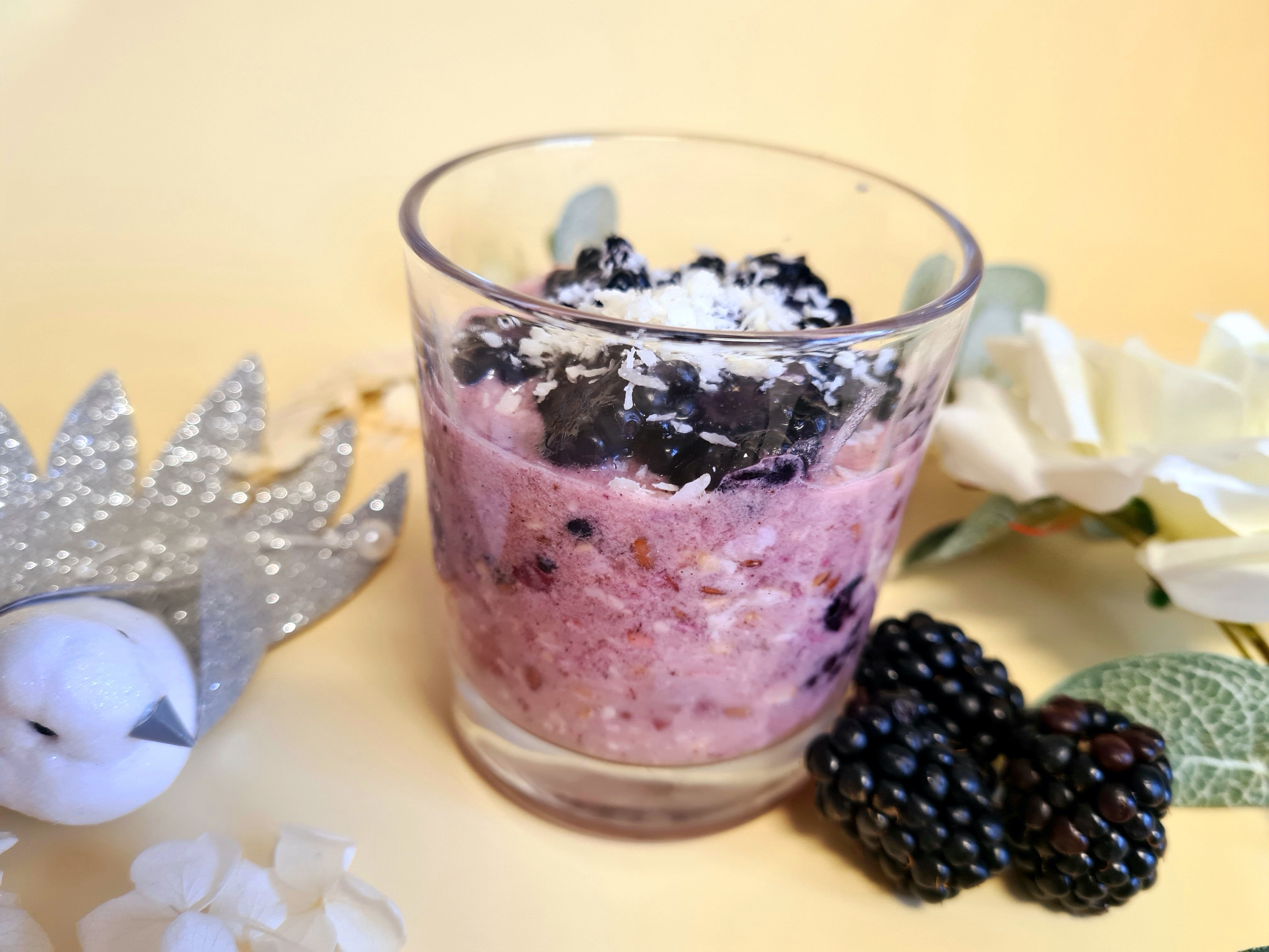 Seara, am pus intr-un borcan toate ingredientele si le-am amestecat, exceptand cele pentru topping pe care le vom pune dimineata. Fructele le lasam la dezghetat inainte, de preferat.