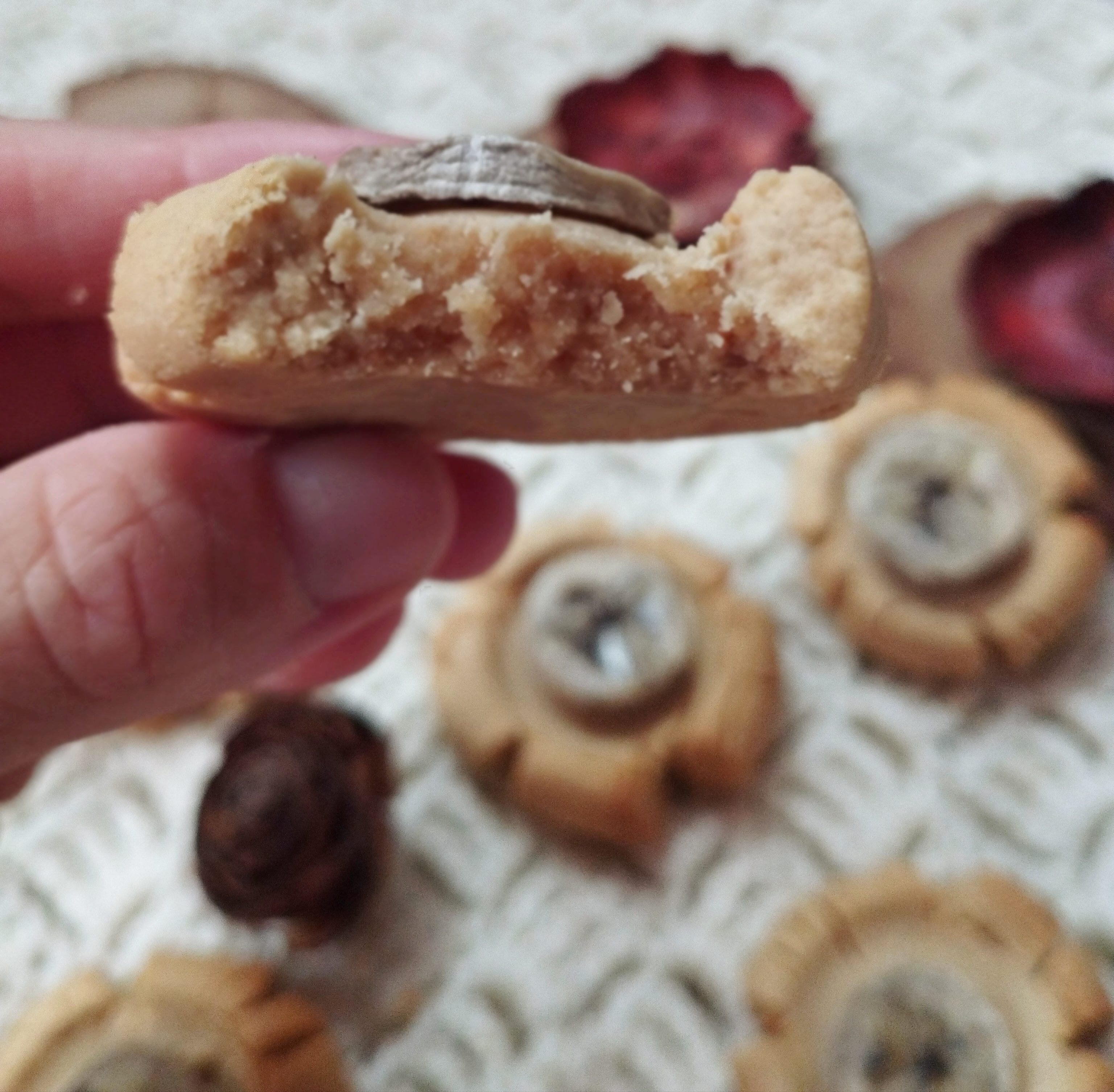 Fiecare biluta am aplatizat-o cu fundul unui paharel de tuica, usor, atat cat sa capete forma de floare. Aluatul va crapa pe margini datorita fragezimii. Am pus in centrul fiecarui biscuit, cate o felie de banana si bagat biscuitii in cuptorul preincis pentru 20 de minute pana li-i s-au rumenit usor marginile.