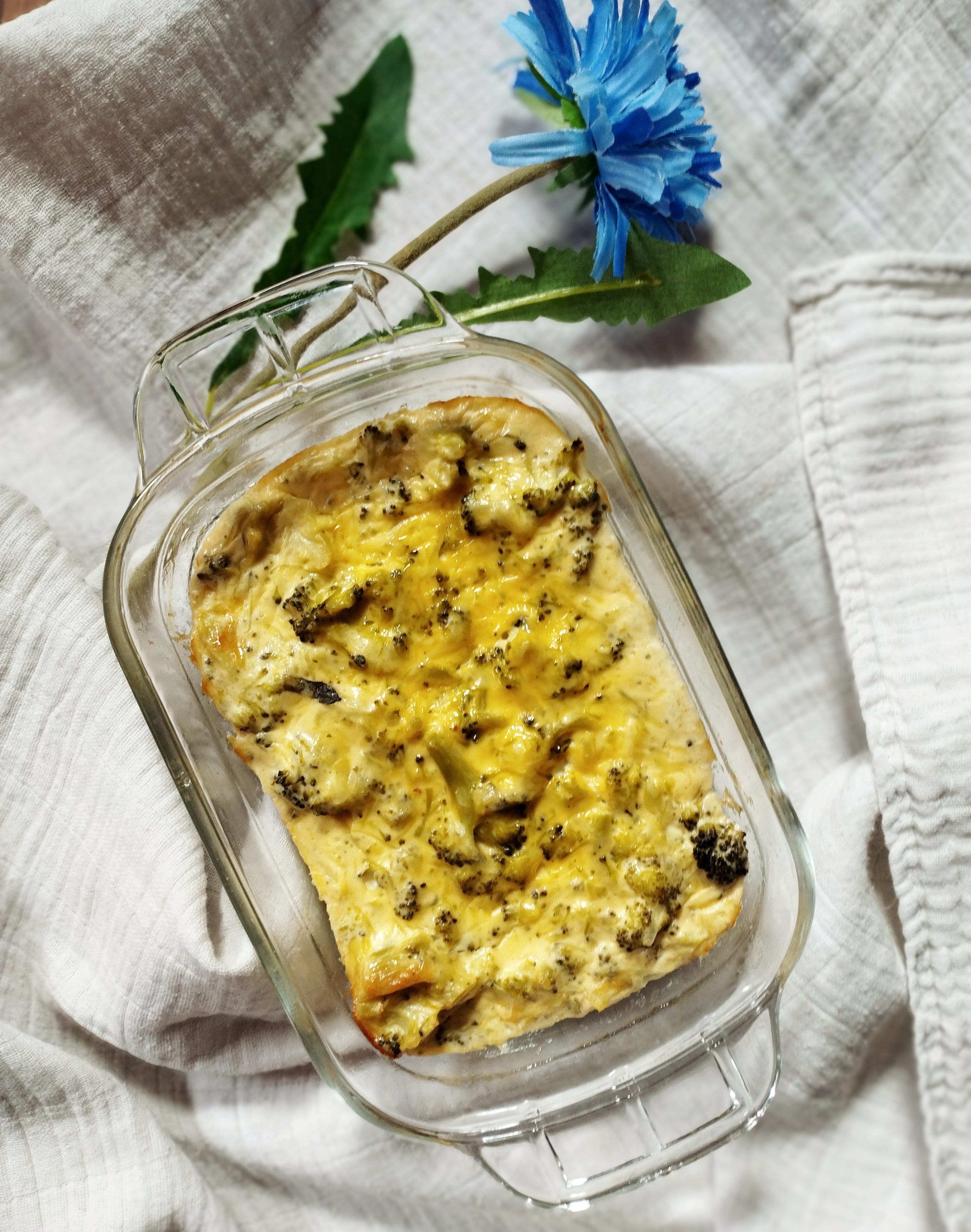Dupa ce am inglobat bine totul am adaugat si broccoli-ul. L-am inglobat si pe el dupa care am pus compozitia in forma de copt unsa cu unt si bagat la copt pentru 40 de minute pana s-a rumenit frumos.