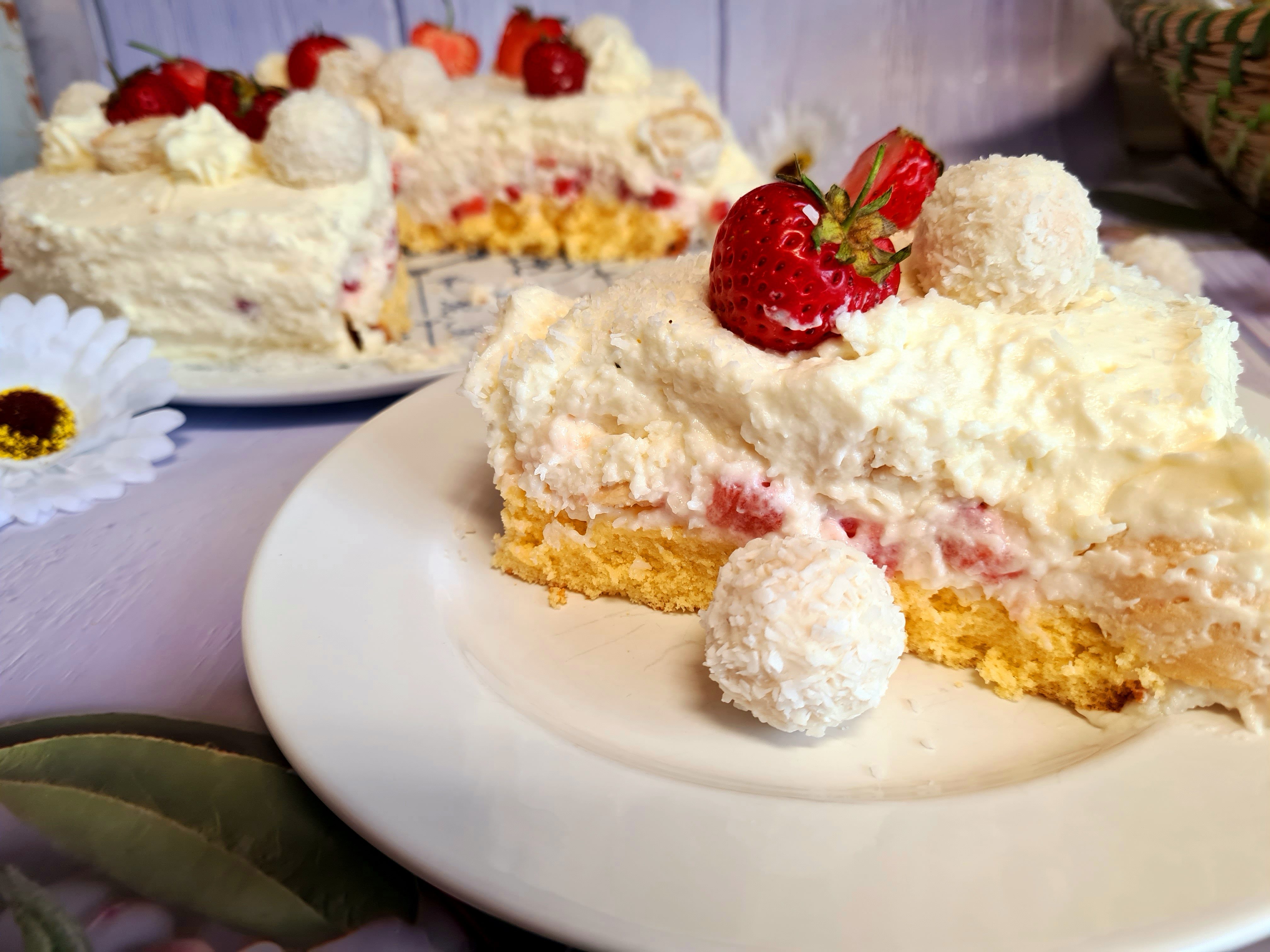 Adaugam crema intr-un pos cu dui in forma de floricica, sau ce avem disponibil, facem de jur imprejurul tortului (pe marginea de sus, fara pereti) floricele avand grija sa lasam spatiu intre ele pentru a avea loc de raffaello. Intre ele am pus Raffaello taiat in jumatate, o data cu partea in sus, o data cu partea in jos. Langa floricelele din crema am pus capsuni, atat intregi cat si taiate pe jumatate, pastrand ideea ca la Raffaello, una intreaga, una jumatate, ca in poza. Am mai pus si pe mijloc 2 bucati de Raffaello si asta a fost tot.
