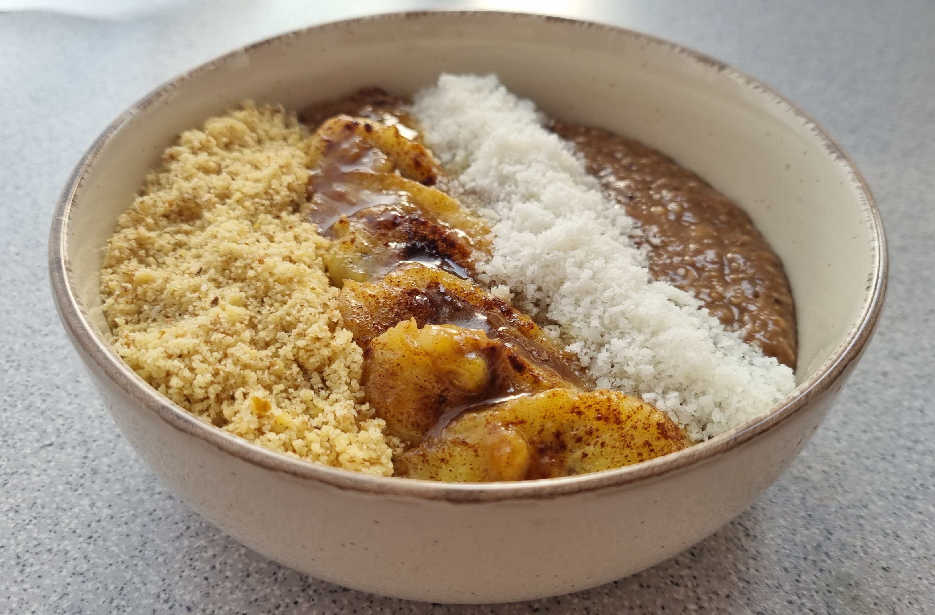 Cand am servit, am pus la baza porridge-ul „ciocolatos”, apoi deasupra un rand de nuca macinata, apoi am aranjat usor feliile de banana „caramelizata” cu tot cu restul de sos gros „caramel” ce a ramas in tigaie si un rand de fulgi de cocos, insa modul de a aseza si decora se poate realiza desigur dupa preferintele fiecaruia.