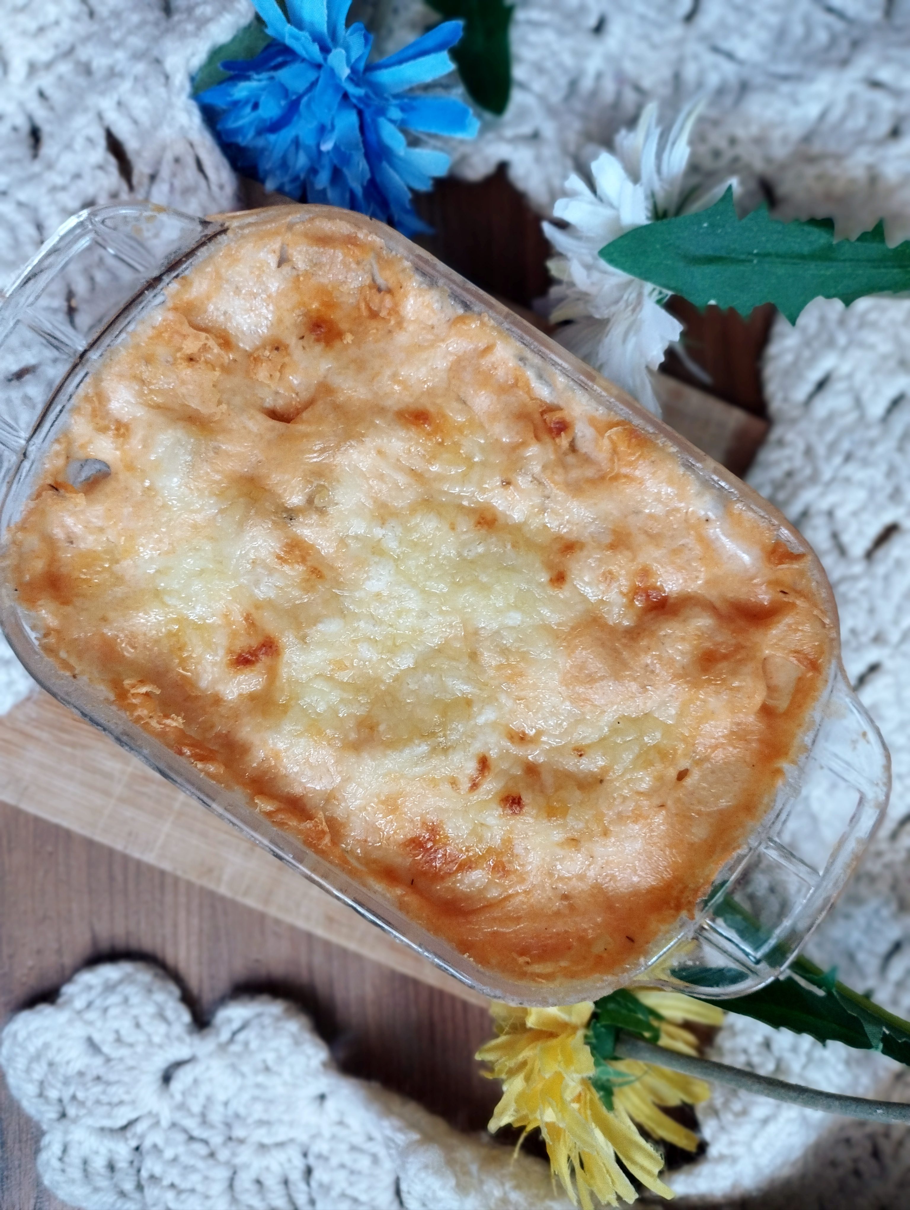 Am tapetat apoi, o forma termorezistenta cu unt si pus compozitia in ea. Deasupra am presarat cascavalul ras dupa care am bagat cartofii la copt, in cuptorul preincis la 150°, pentru 20-25 de minute, pana cascavalul de deasupra devine rumen si se topeste tot.