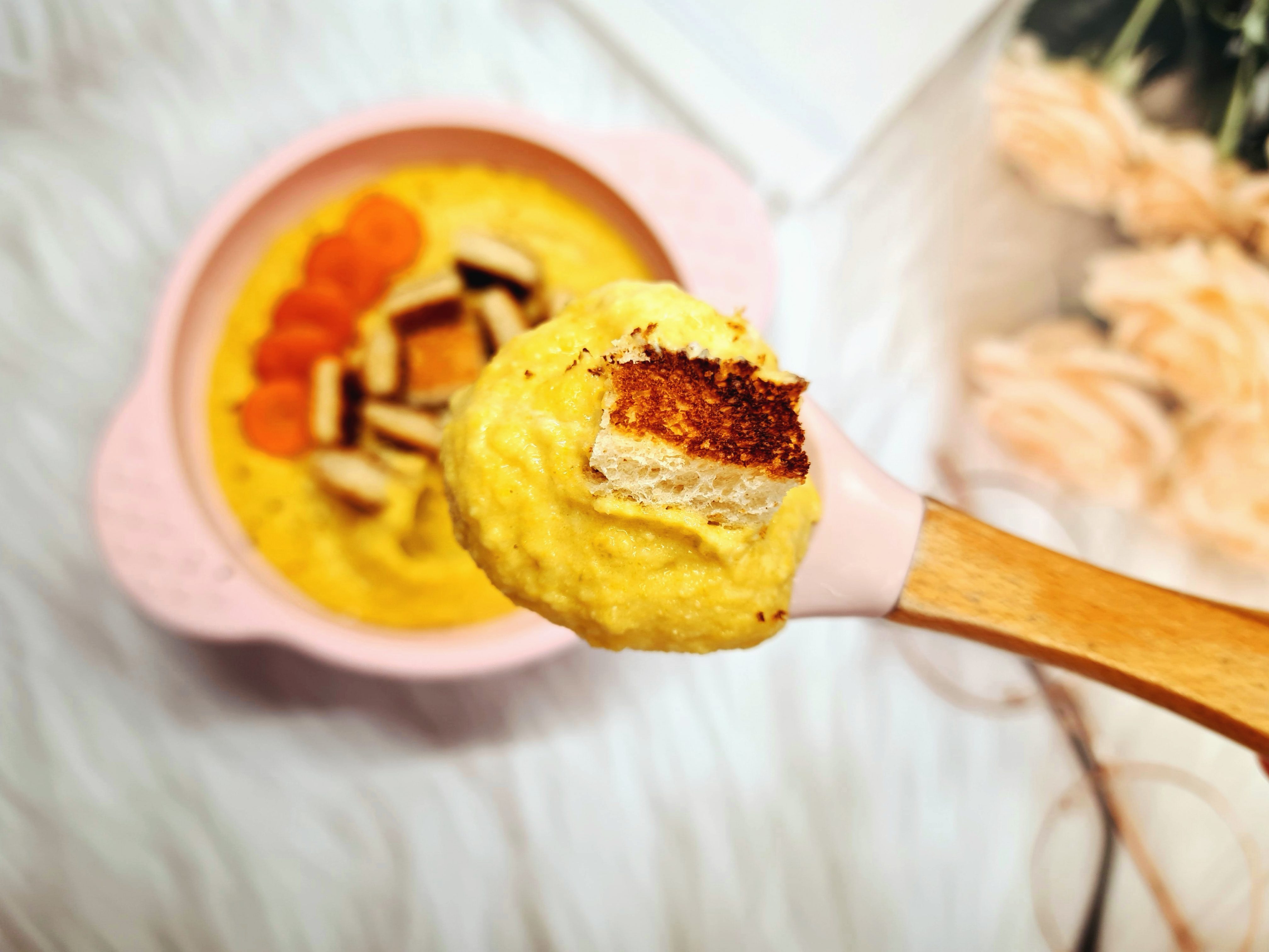 Am servit supa crema cu painea prajita.