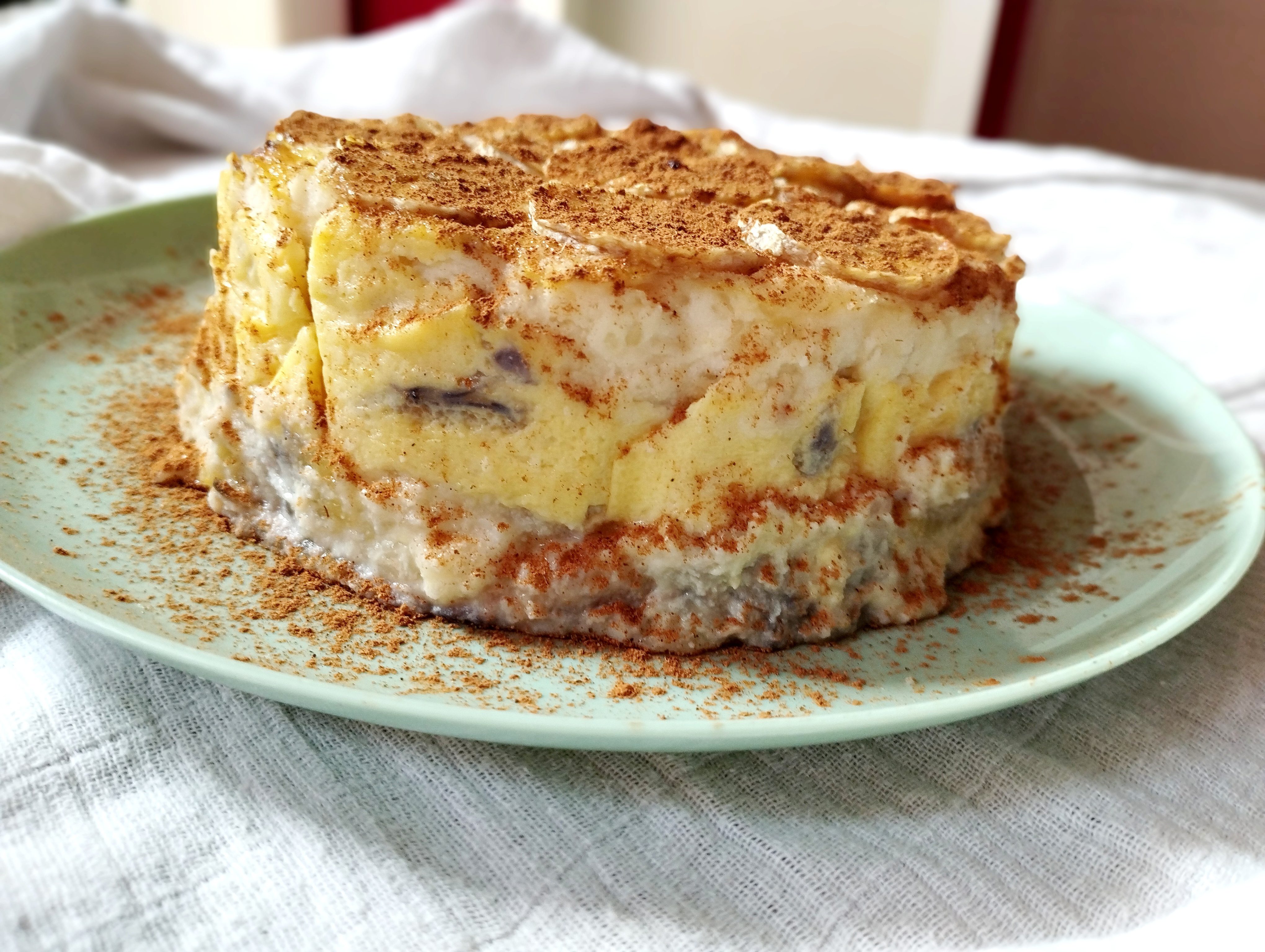 Astfel ca am pus pe fundul formei tapetate cu hartie, un prim strat de felii de banana. Peste, a urmat 1/2 din crema, apoi iar un strat de banana, branza toata, iar banana, restul de crema, deasupra iar banana, dar de aceasta data taiata feliute rotunde si presarat pe toata suprafata, scortisoara.