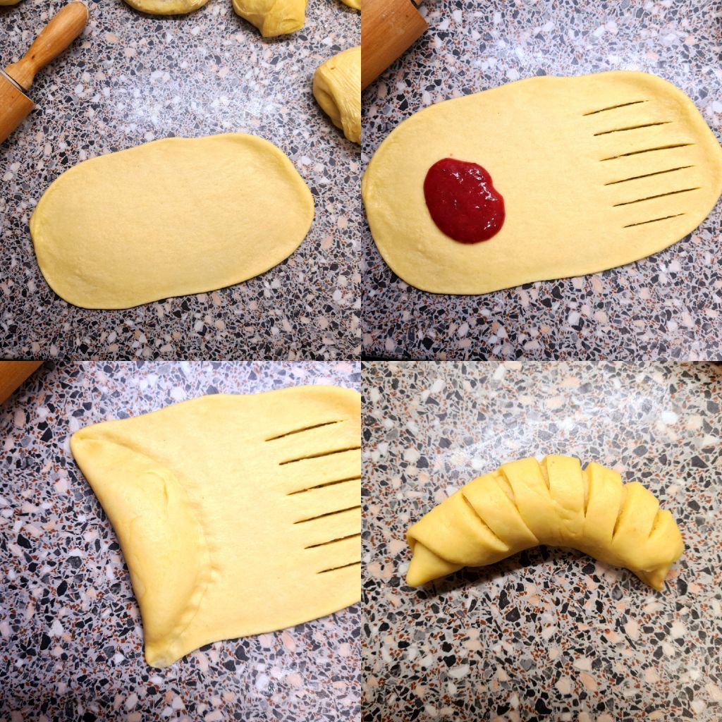 Luam fiecare bucatica si o intindem in dreptunghi. Punem o lingurita de umplutura, pentru copii am folosit magiun de prune fara zahar, reteta aici. Punem compozitia intr-un capat, apoi inchidem bine (ca la buzunare/pateuri), crestam cealalta parte cu cutitul si rulam. Aveti pasii in imaginea de mai jos.