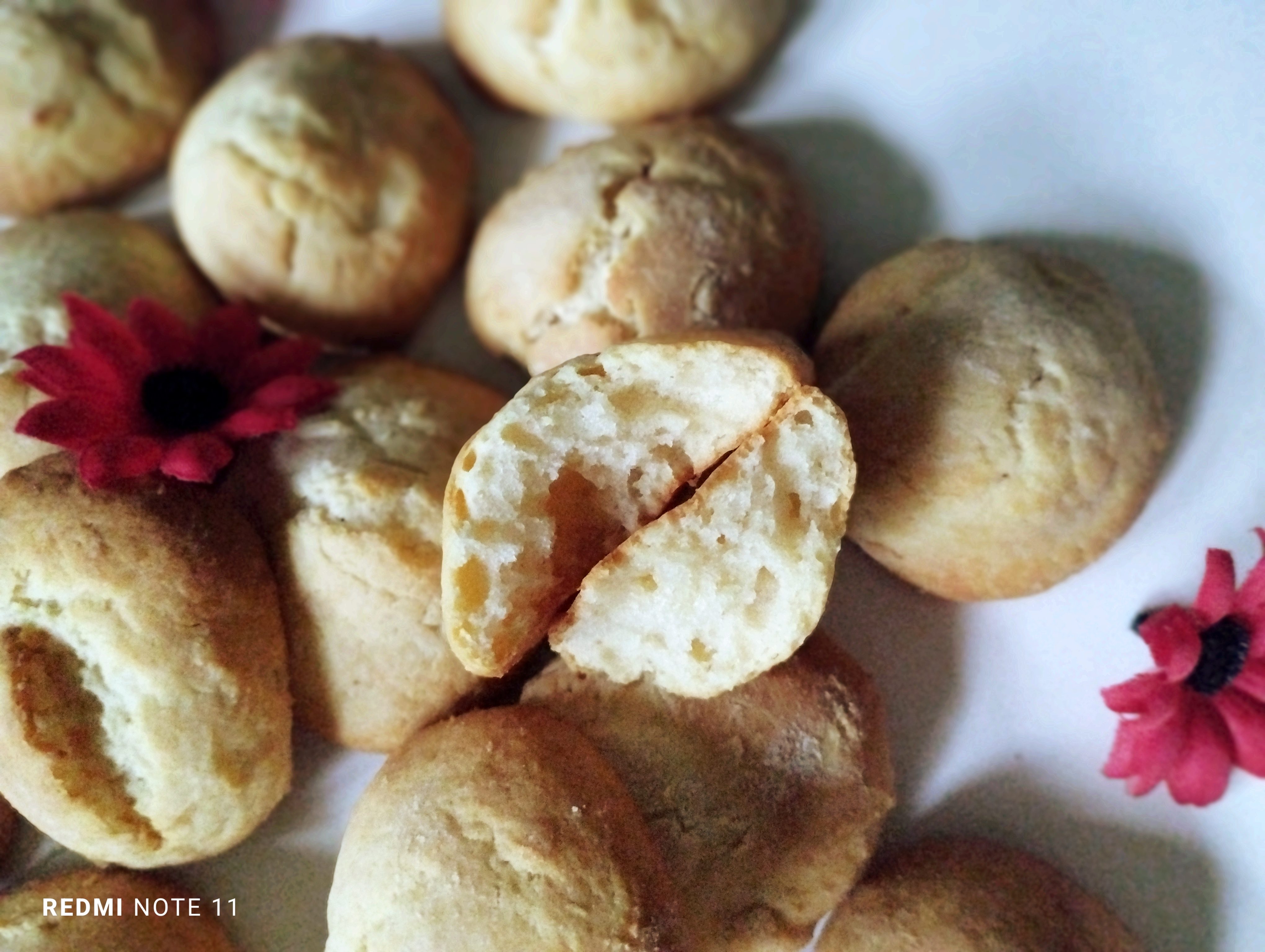 Am pus intai amidonul amestecat cu praful de copt dupa care am tot adaugat faina pana compozitia s-a legat usor. Nu trebuie sa devina aluat de intins pe blat, doar cat sa se lege. Aluatul meu era usor lipicios, adica n-as fi putut face bilute cu mainile din el.